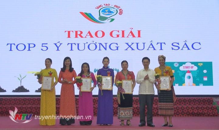 Đồng chí Nguyễn Xuân Sơn - Phó Bí thư Thường trực Tỉnh ủy, Chủ tịch HĐND tỉnh trao giải cho Top 5 ý tưởng khởi nghiệp, khởi sự xuất sắc.