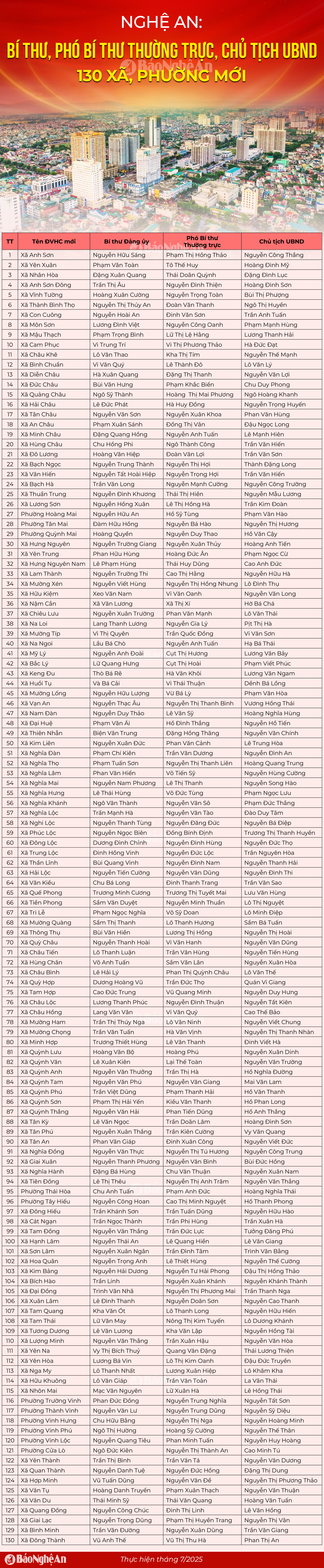 Danh sách Bí thư, Phó Bí thư thường trực, Chủ tịch UBND 130 xã, phường mới của tỉnh Nghệ An.