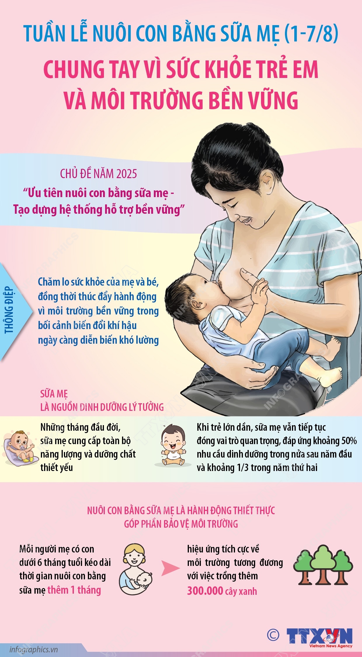(TTXVN 2/8) Từ ngày 1-7/8 hằng năm, Tuần lễ Thế giới Nuôi con bằng sữa mẹ được tổ chức rộng khắp tại nhiều quốc gia và vùng lãnh thổ nhằm nâng cao nhận thức về lợi ích của việc nuôi con bằng sữa mẹ. Được khởi xướng từ năm 1992 bởi Liên minh Thế giới hành động vì nuôi con bằng sữa mẹ (WABA), sự kiện này đã trở thành hoạt động thường niên trên phạm vi toàn cầu.