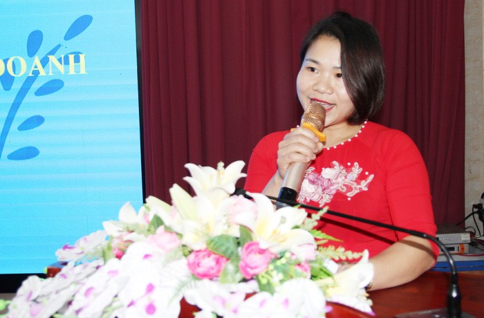 Bà Trần Thị Thúy, xã Quỳnh Ngọc, huyện Quỳnh Lưu đạt giải nhì với dự án "tiệm làm tóc" phát biểu cảm tưởng tại lễ trao giải
